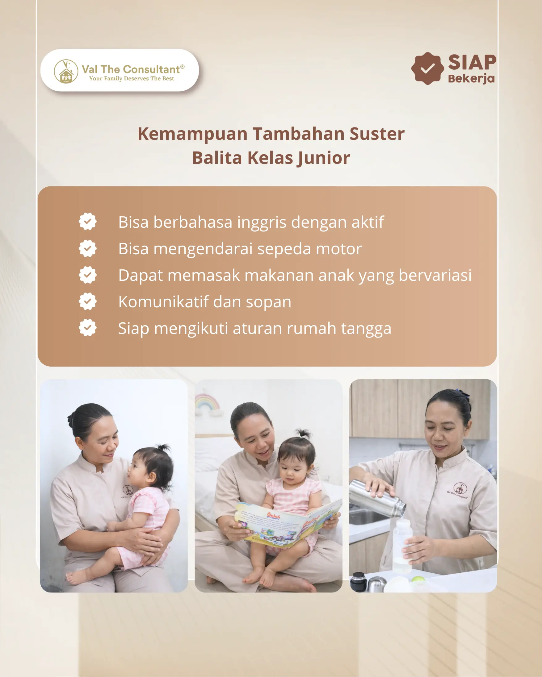 Ramah, sabar, telaten, komunikatif, dan bertanggung jawab dalam merawat anak, serta siap mengikuti aturan rumah tangga.