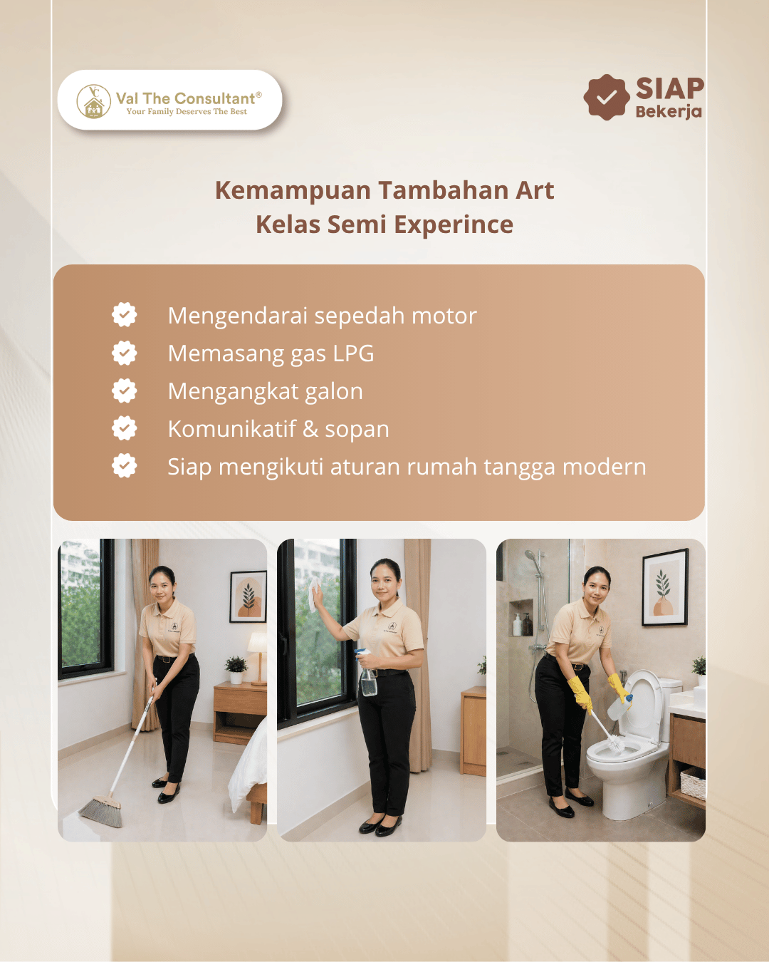 Memiliki pengalaman kerja sebagai Asisten Rumah Tangga (ART) dengan kemampuan dasar hingga