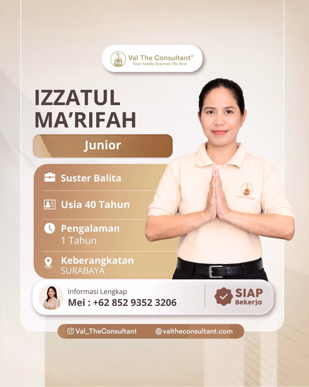 Izzatul Ma’rifah Asal NTT adalah Pekerja rumah tangga berusia 40 tahun dengan pengalaman 1 tahun yang memiliki semangat tinggi dan siap bekerja penuh tanggung jawab.